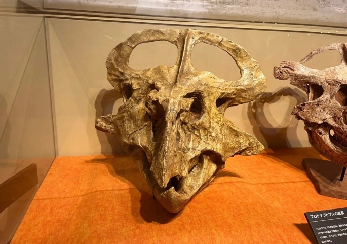 プロトケラトプスはかっこよさだけでなく、成長段階ごとの化石も充実しています。これは日本では珍しい6体もの成長段階別のプロトケラトプスの頭骨を並べた展示です。誰でもわかると思いますが、右の小さい幼体から左の大きな成体のように個体発生していったと考えられています。
