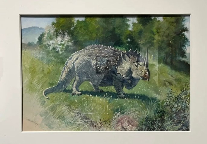 AMNH 5116 らしい顔のトリケラトプスと目の位置がワニっぽいティランノサウルス Tyrannosaurus が対峙していて、奥に関係ないティランノサウルスも立っています。両者をライバルとして描いた作品は数多ありますが、その走りと言えるような作品がこれでしょう。