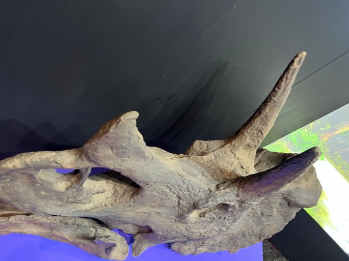 本展において重要なのは、本種が単に“最後期に登場した鳥盤類”というだけでなく、実際に白亜紀最末期まで生き延び、K-Pgイベントによって絶滅した当事者であるという点です。つまり、トリケラトプス・プロルススは絶滅の過程を遠くから見ていた存在ではなく、思いっきりその渦中にあった生物であり、急激な気候変動と生態系の崩壊を直接受けた動物の代表と言えます。ティランノサウルスもそうです。