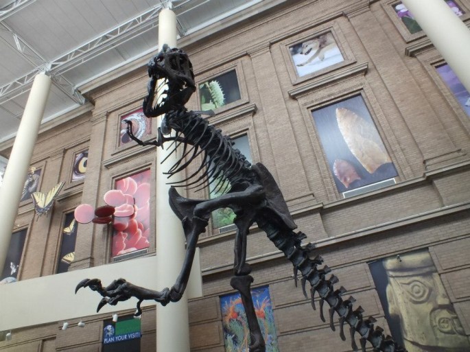 エントランスで出迎えるのは古めかしくもダイナミックなポージングで組み上げられたティラノサウルス・レックス Tyrannosaurus rex