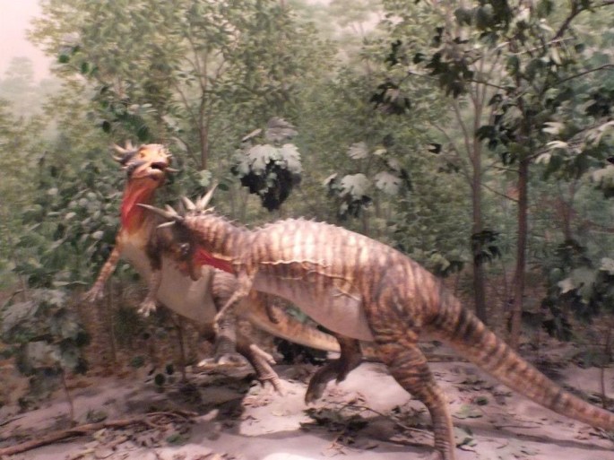 の生体復元模型。頭同士ではなく頭以外の部分に頭をぶつけて種内競争をしたという仮説に基づいた復元みたい。
