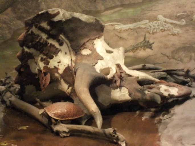 トリケラトプス・ホリドゥス Triceratops horridus 亜成体頭骨の模型が転がしてある。皮膚がところどころに残してあるデザインだけど、既知の化石記録と比べるとウロコが細かすぎるように見えます。