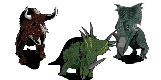 のような小型で顔の装飾が目立たない種類も含まれるタクサ(グループ)ですが、ケラトプス類はその角竜の中でもより新しく登場したタイプの角竜類で、トリケラトプスの他、カスモサウルス Chasmosaurus 、スティラコサウルス Styracosaurus、ナストケラトプス Nasutoceratops といった大型で派手な装飾のあるタイプの恐竜です。