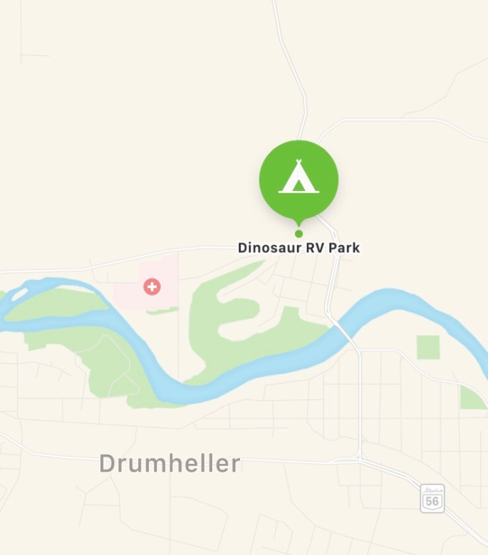 そう、取ってきたザックをどこに届けるかって質問。レッドディア川の河川敷に勝手こいてテント張ってるとはとてもじゃないけど言えず、とっさにドラムへラーの地図を出してキャンプ場をサーチ。さりげなく。そして『ダイナソーRVパーク』という楽しげなキャンプ場が良いところにあったので、そこだと答えました。