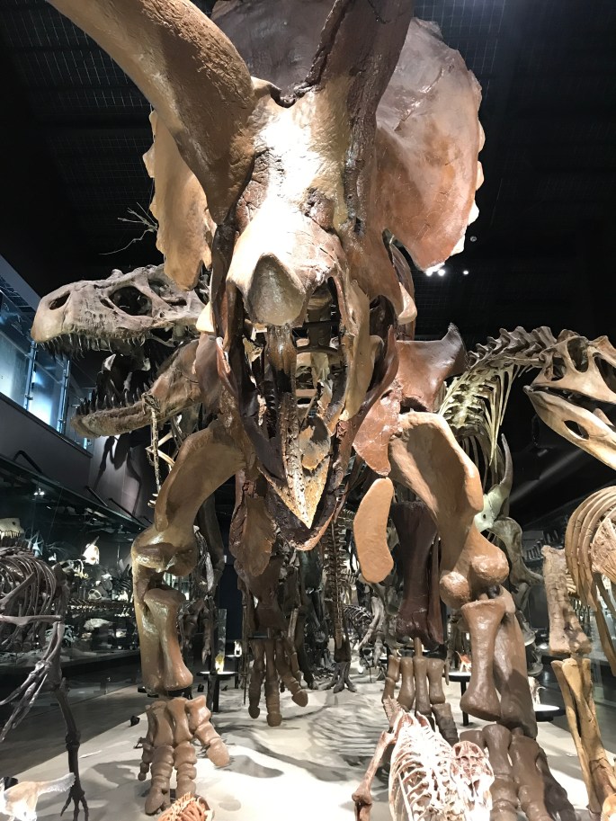 博物館が真に紹介したいのはここまででしょうが、僕が一番紹介したいのは「恐竜大行進」と呼ばれる組立骨格の群れ。特にその先頭(厳密には先頭ではない)に佇むトリケラトプス Triceratops 亜成体。