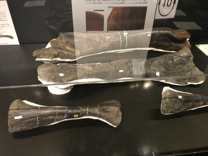マイアサウラの骨。幼体と成体の脛骨の比較です(毎度ながら反射すみません)。