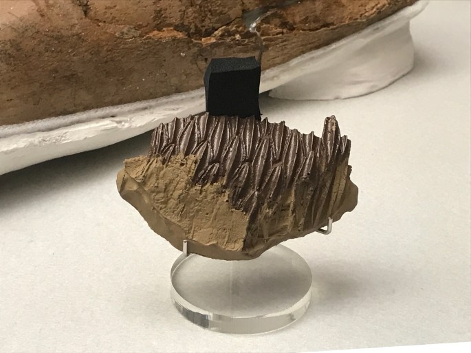 ハドロサウルス類 Hadrosauridae の重要なアイデンティティ、デンタルバッテリーも載せますね。小さい歯がロケット鉛筆(って通じる?)のように鈴なりになっている構造で、植物をすりつぶすおろし金のような構造になっています。ケラトプス類にも似た構造がありますが、形状や想定される機能が少し異なります(のちのち紹介するかも)。