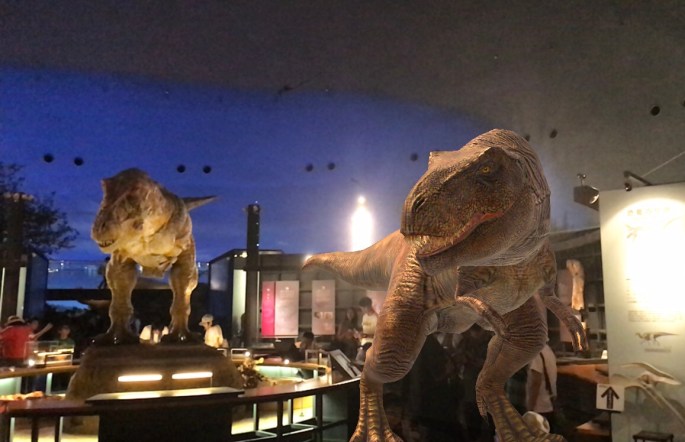 まずはレクシィばあさん(某ゲームのAR)と黄色いティラノサウルスロボットのツーショット。ちなみに以前中央にあったのはマイアサウラの巣の復元でした。