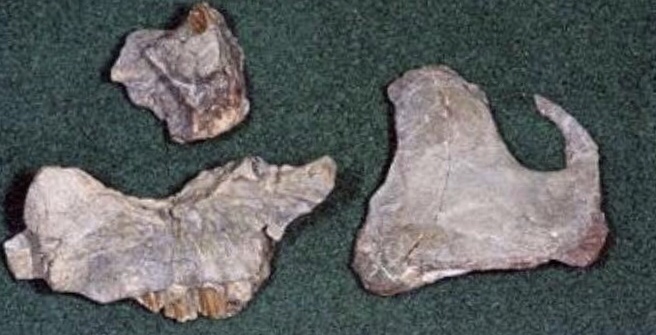 自信はないですが、歯が残っているのでおそらく左二つが上顎骨 maxilla 、左上の小さいのが左歯骨 dentary、その下が左上顎骨 maxilla、右が鼻腔を含んでいるので右前上顎骨 premaxilla かなと思いますだそうです。