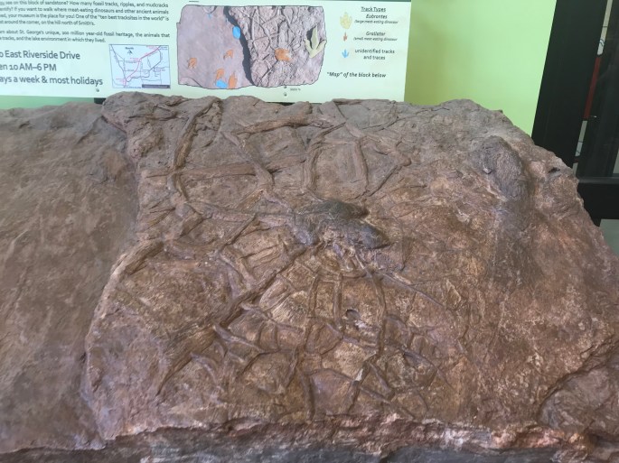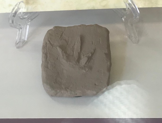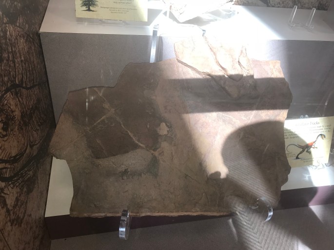 グララトル Grallator と呼ばれる足跡化石。ちょうど光が当たりまくってて大変申し訳ないです。