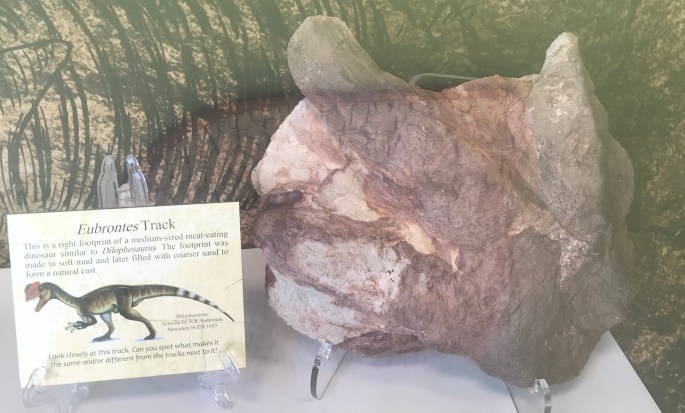 エウブロンテスは知ってましたよ。19世紀初めごろ、イギリスで初めて恐竜が記録されましたが、それよりも前にコネティカット州で大昔の“鳥類”と思われる足跡が発見されたんですが、それがエウブロンテスとして記載されたという話でした。エウブロンテスは今では獣脚類 Theropod のものと思われていますが、恐竜と鳥類の類似性は実は最初の恐竜が記載されるよりも前から示唆されていたようなものですね。うんうん。