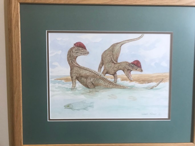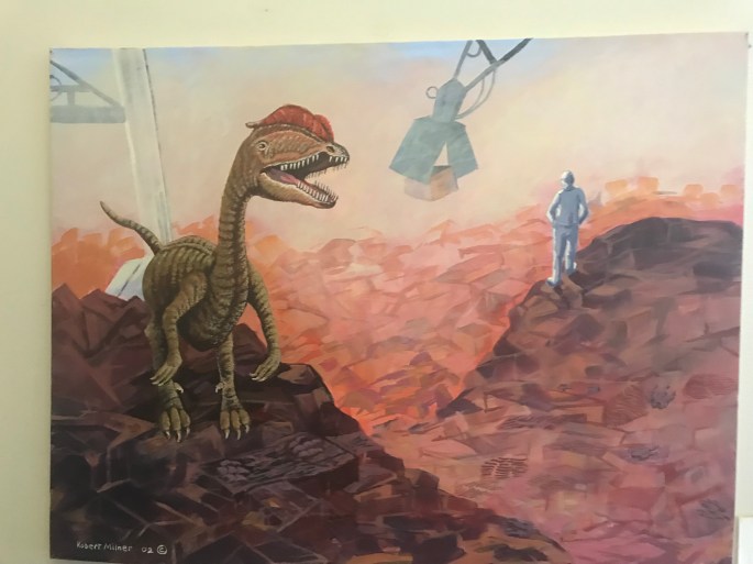 入口近くに絵画の展示。やたらとディロフォサウルス(トサカが目立つ恐竜)とコエロフィシス・ロデシエンシス Coelophysis rhodesiensis (細長い恐竜)を描いたものが多いです。