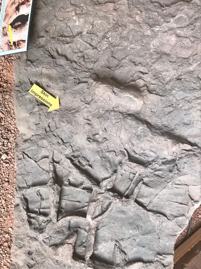 グララトル Grallator の皮膚印象付きの足跡。こうやってよーく見ると👀よーく見ると、第3趾(真ん中の長い足指)の付け根近くに鱗のような痕跡があります。
