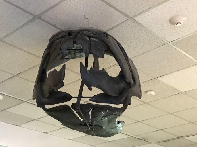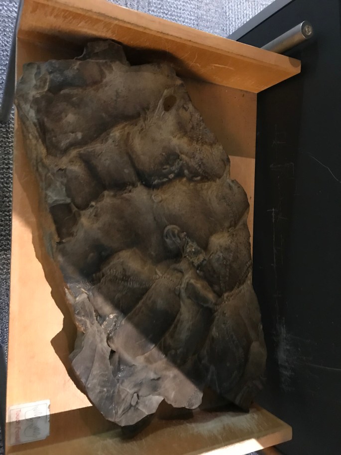 ドゥンクレオステウス Duncleosteus を下から見上げるのは珍しいですね。脳天は天井にくっついていて物理的に観察不能。まあほかの博物館でもしょっちゅう見る標本なので良いですけど。