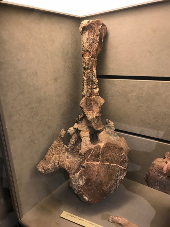 ステゴサウルス Stegosaurus の骨盤と尾椎とプレート(骨板)。敢えてクリーニングが完了してない物を展示しているっぽいです。ちょっと珍しいですね。