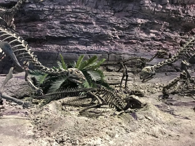 展示はジュラ紀(モリソン層)の動物たちの骨がジュラ紀のジオラマの中にいるという変わったもの。僕は好きです。