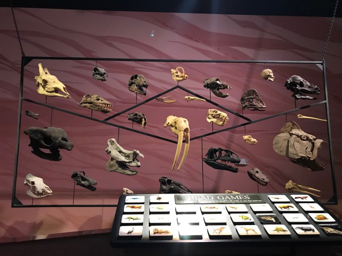 さまざまな動物の頭骨。キリン Giraffa 、ステゴサウルス Stegosaurus 、ディメトロドン Dimetrodon、クビナガリュウ類 Plesiosaur、バビルサ Babyrousa babyrussa、プテロダウストロ Pterodaustro アリクイ Vermilingua、キロステノテス Chirostenotes 、ヒト Homo sapiens、パキケファロサウルス Pachycephalosaurus 、ランフォリンクス Rhamphorhynchus 、セイウチ Odobenus rosmarus、アロサウルス Allosaurus 、シファクティヌス Xiphactinus、ウマ Equus caballus など。