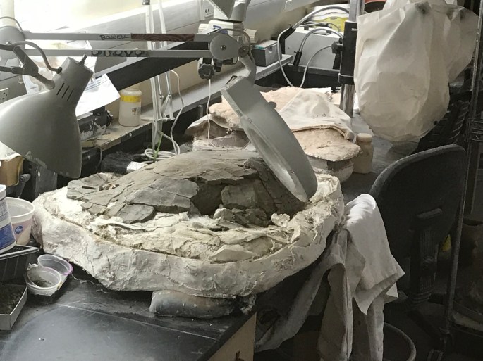 クリーニングルームのティラノサウルス類 Tyrannosaurid の頭骨。