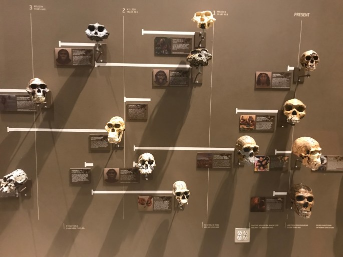 化石人類(ヒト亜属 Hominina)の頭骨コレクション。