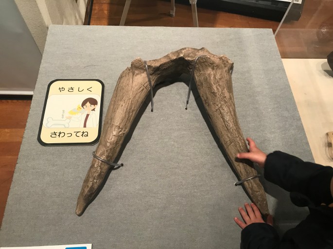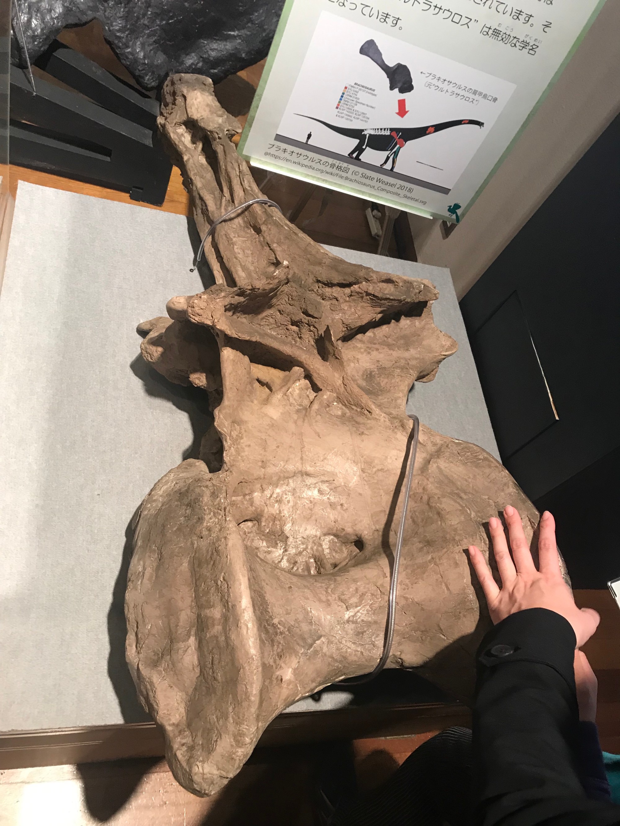 お触り可のスーパーサウルス Supersaurus 胴椎。レプリカ。キャプションによると元“ウルトラサウロス” “Ultrasauros” のホロタイプ。