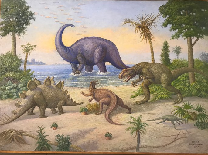アーネスト・アンターマン(1953年)によるモリソンの生物相を描いた古典的な絵画。描かれているのはブロントサウルス、ステゴサウルス、カンプトサウルス、アロサウルス、コエルルスでしょうか。竜脚類は顔が細長いのでディプロドクスかもしれません。