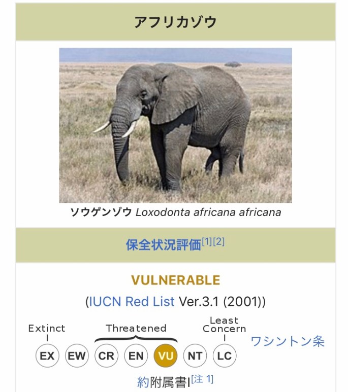 ところがそこで思ったんですよ。犀角や象牙の需要が高いのは中国で、日本語で「犀角買うな」とか「象牙買うな」と言ったところで、それらを買う日本人は消費者全体からするとわずかな割合。そして日本人が真に圧迫しているのはウナギではないかと思い出しました。市場に最も多く出回っているウナギであるニホンウナギ Anguilla japonica とアメリカウナギ A. americana は絶滅危惧ⅠB(絶滅危機)でインドサイ Ceratotherium simum (絶滅危惧Ⅱ(危急))、シロサイとアフリカゾウ(減少傾向)、インドゾウ(低懸念)よりも絶滅に近いとくれば、日本人のウナギ食を看過して外国人の象牙犀角に口出しするのは筋が通りません。