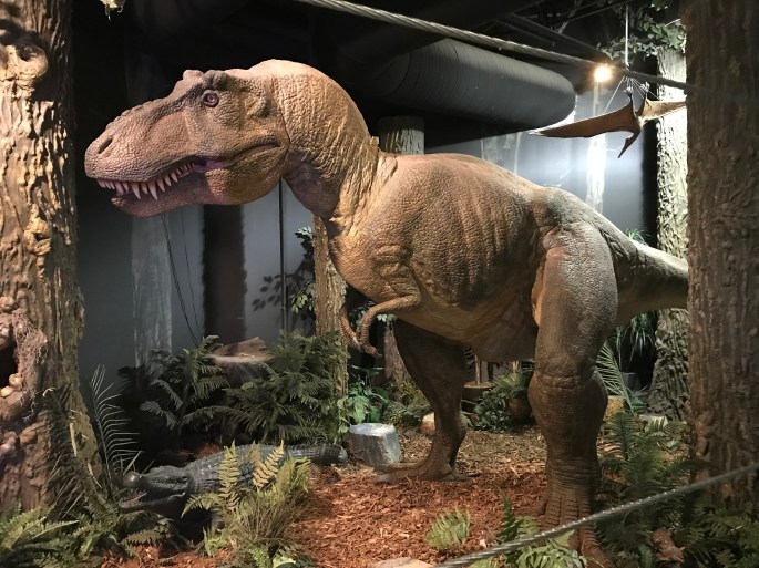 翼竜とワニを従えるティラノサウルス。