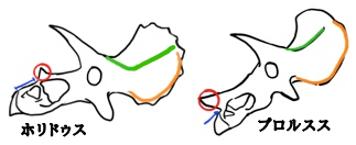 ②ホリドゥスは吻部(鼻角とクチバシの間)が長い。プロルススは吻部が短い。(青い線/矢印)
