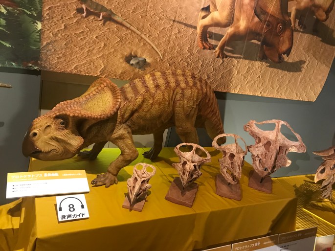 プロトケラトプス Protoceratops の生体復元模型も。(尾はもっと断面が縦長の楕円形になるような形じゃないかな)