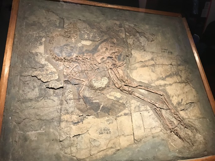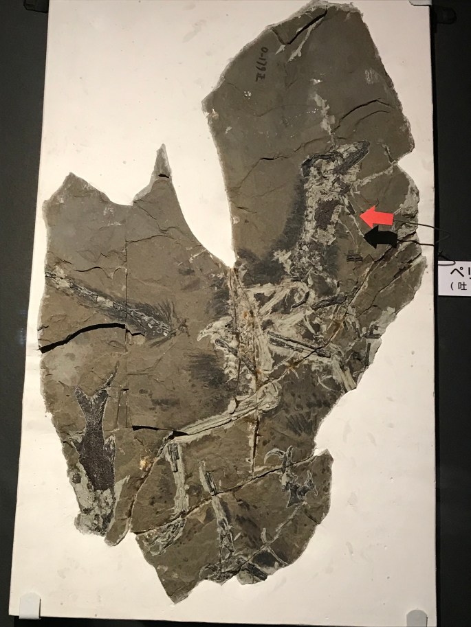 比較対象物が写ってないのでアレですが、かなり大きな輪を描いた配置です。これを産んだ動物はかなり大きなコエルロサウルス類だと思いますが、どのように保護したのかなど想像力を掻き立てるような展示です(放置と抱卵の中間と言われていますが)。