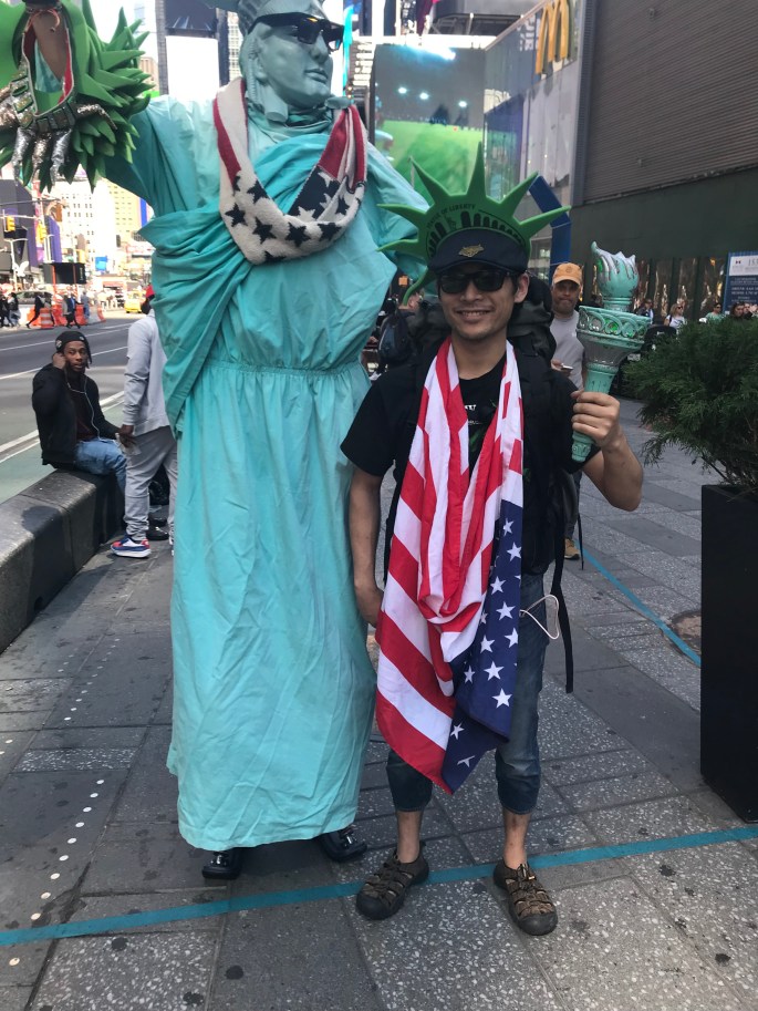 観光客相手にアコギな商売をしている自由の女神(左)。手招きしてきて何の説明もなくこの格好をさせてきて20ドル要求してくる押し売り野郎。親切を装ったラスタファリアンがこの写真を撮ってくれたのですが、なんとこいつもグルでCDを実質40ドルで押し売りしてきます。なのでタイムズスクエアに行かれる方はお気を付けください。