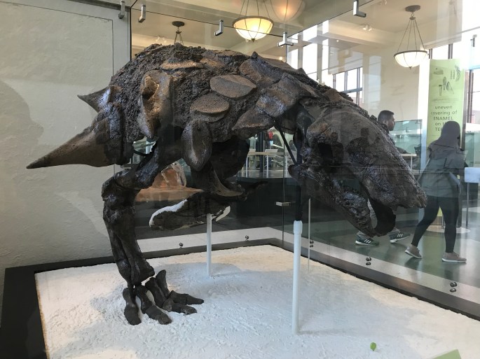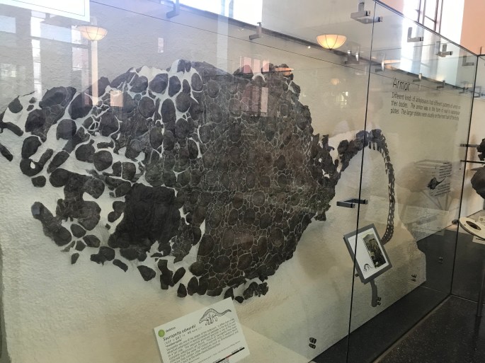 なんと古生物の展示ホールがいくつかあるのですが、恐竜は竜盤類と鳥盤類でホールが分けられていました。これも有名なアロサウルスのマウント。