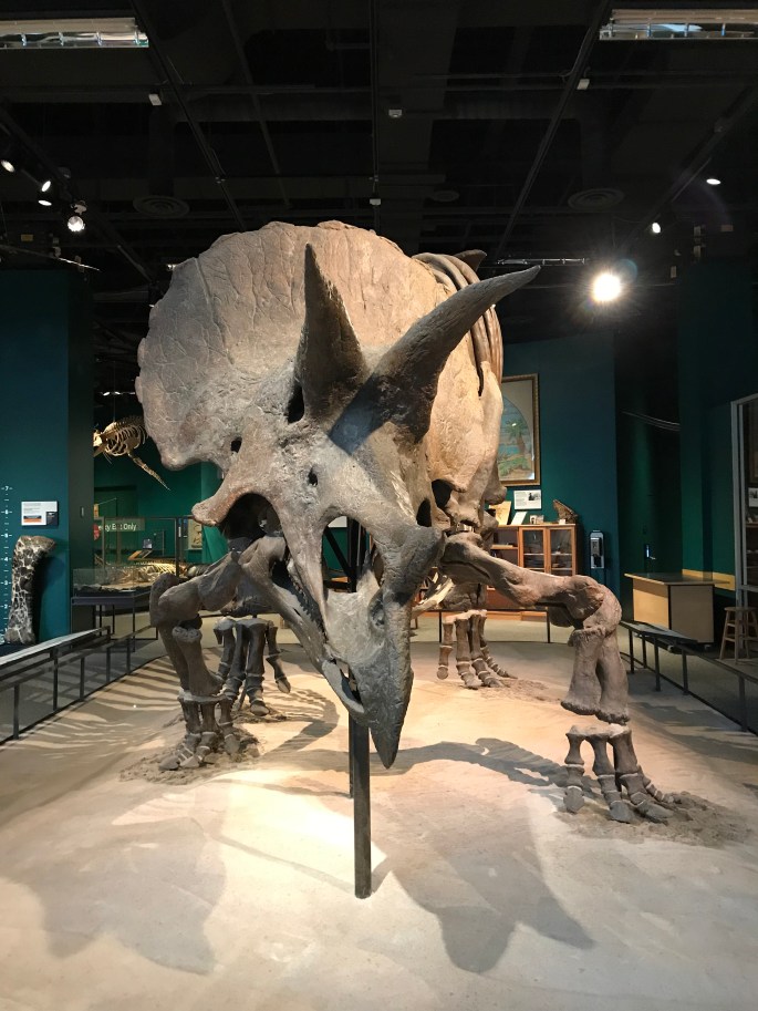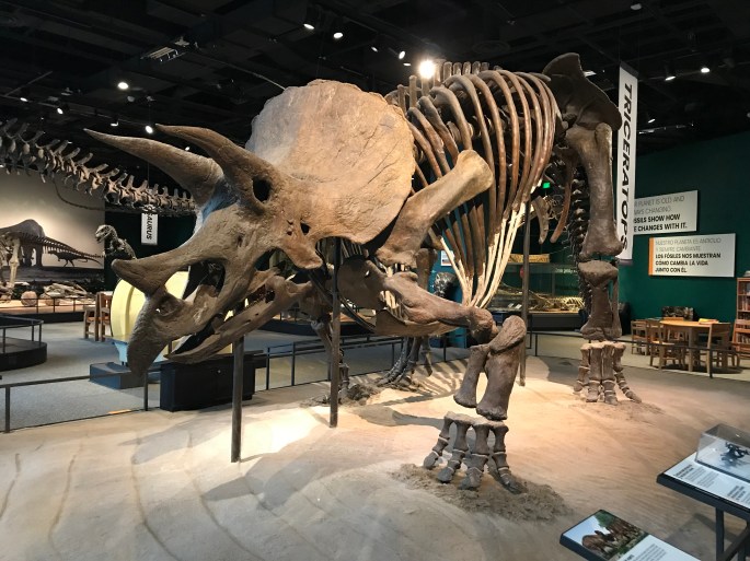 右からトリケラトプス Triceratops、ステゴサウルス Stegosaurus、ディプロドクス Diplodocus と絵に描いたような恐竜の展示ホール。