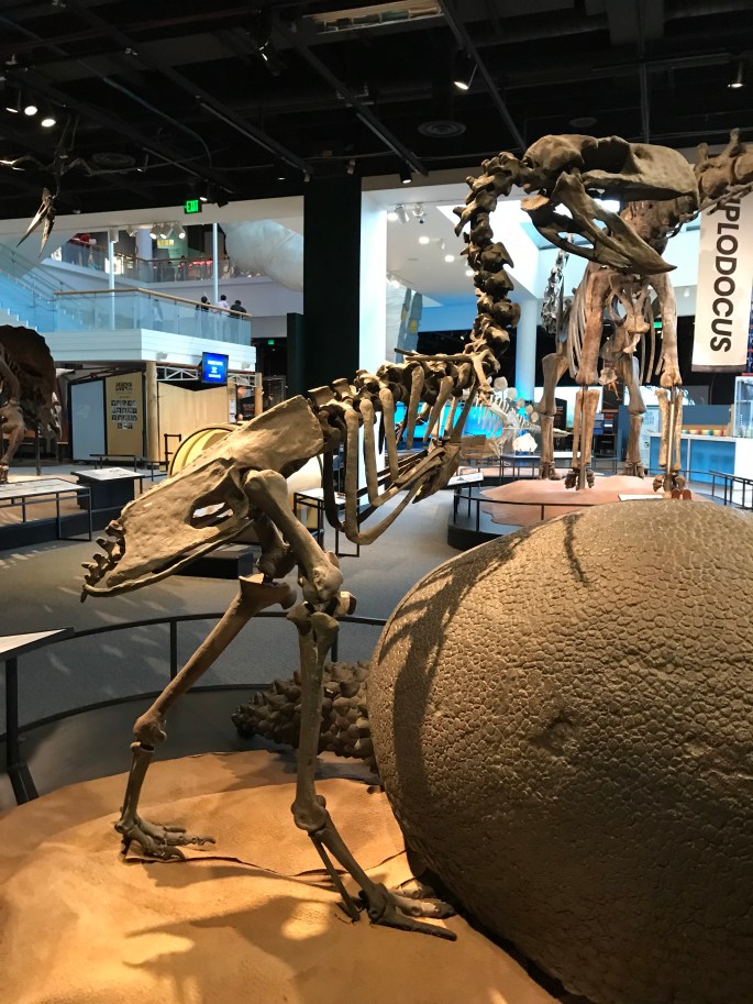 右からトリケラトプス Triceratops、ステゴサウルス Stegosaurus、ディプロドクス Diplodocus と絵に描いたような恐竜の展示ホール。