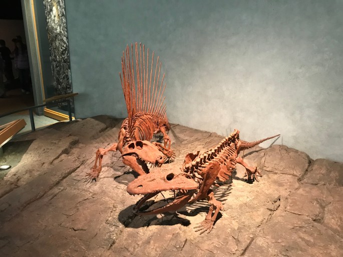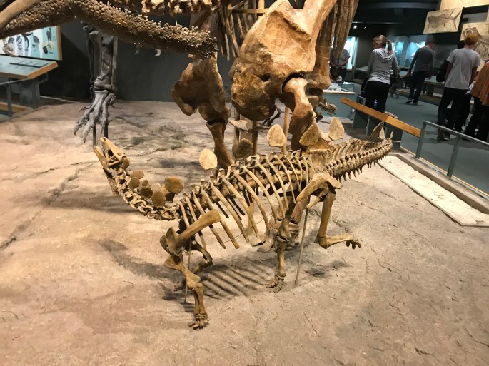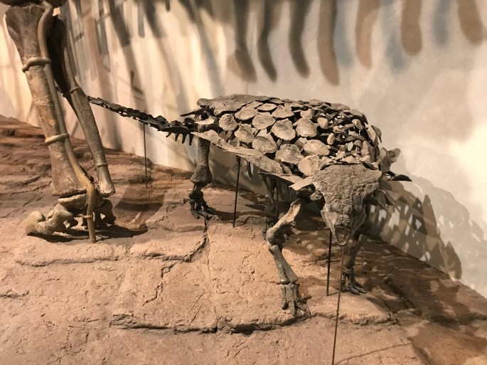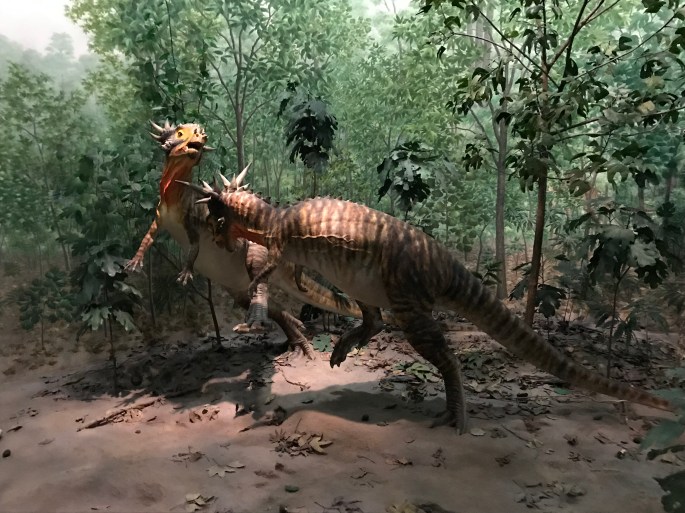 有名な展示物。アロサウルス Allosaurus から子を守るステゴサウルス Stegosaurus