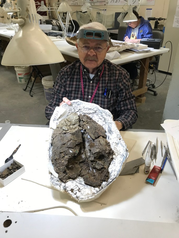プレパレーターのおじさんとデンバー層のカメの化石。