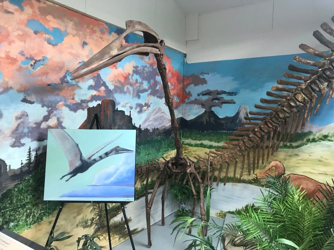 よく見るケツァルコアトルス・ノルトロピ Q. northropi の復元骨格は飛んでいる姿、または高い位置にある、そして大抵はその両方なのですが、これは客の目線の高さに立っています。巨大すぎない標本に基づくマウントなのが現実的ですが、たぶん肘がまっすぐすぎます。