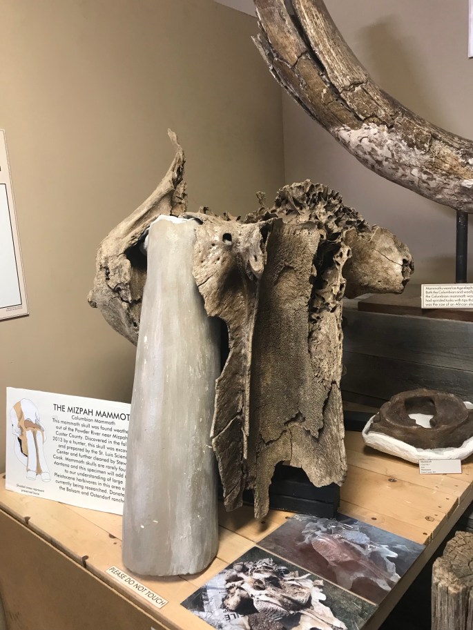カスター郡パウダー川近くのミズパー Mizpah という場所で発見されたコロンビアマンモスの頭骨要素。実物。