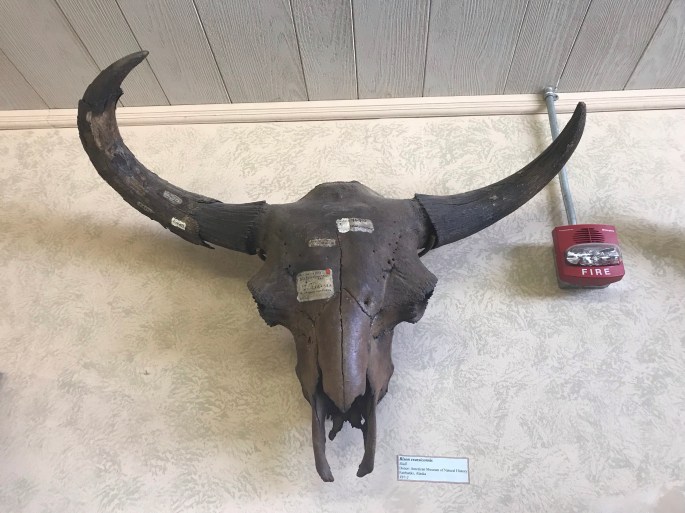 バイソン・クラッシコルニス Bison crassicornis という更新世のバイソンの一種。右の角だけ角質の鞘が保存されてます。中生代生物だったらすごいこと。