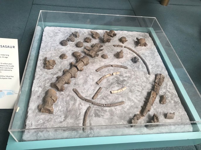 この不完全な骨格は胴椎、肋骨、その他の断片からなるモササウルス類(プラテカルプス Platecarpus)の化石。推定全長6m。