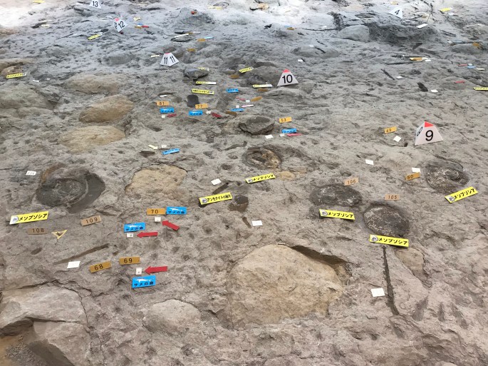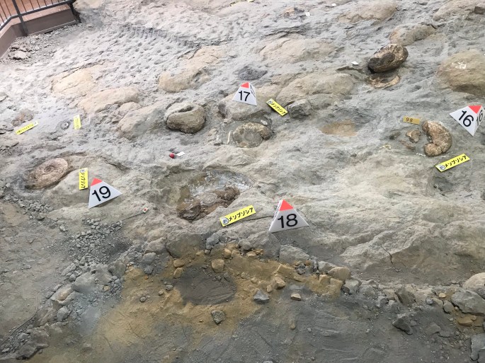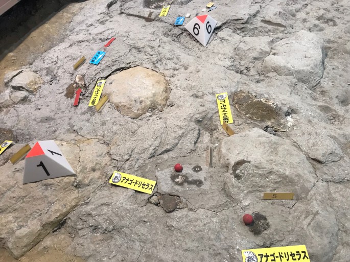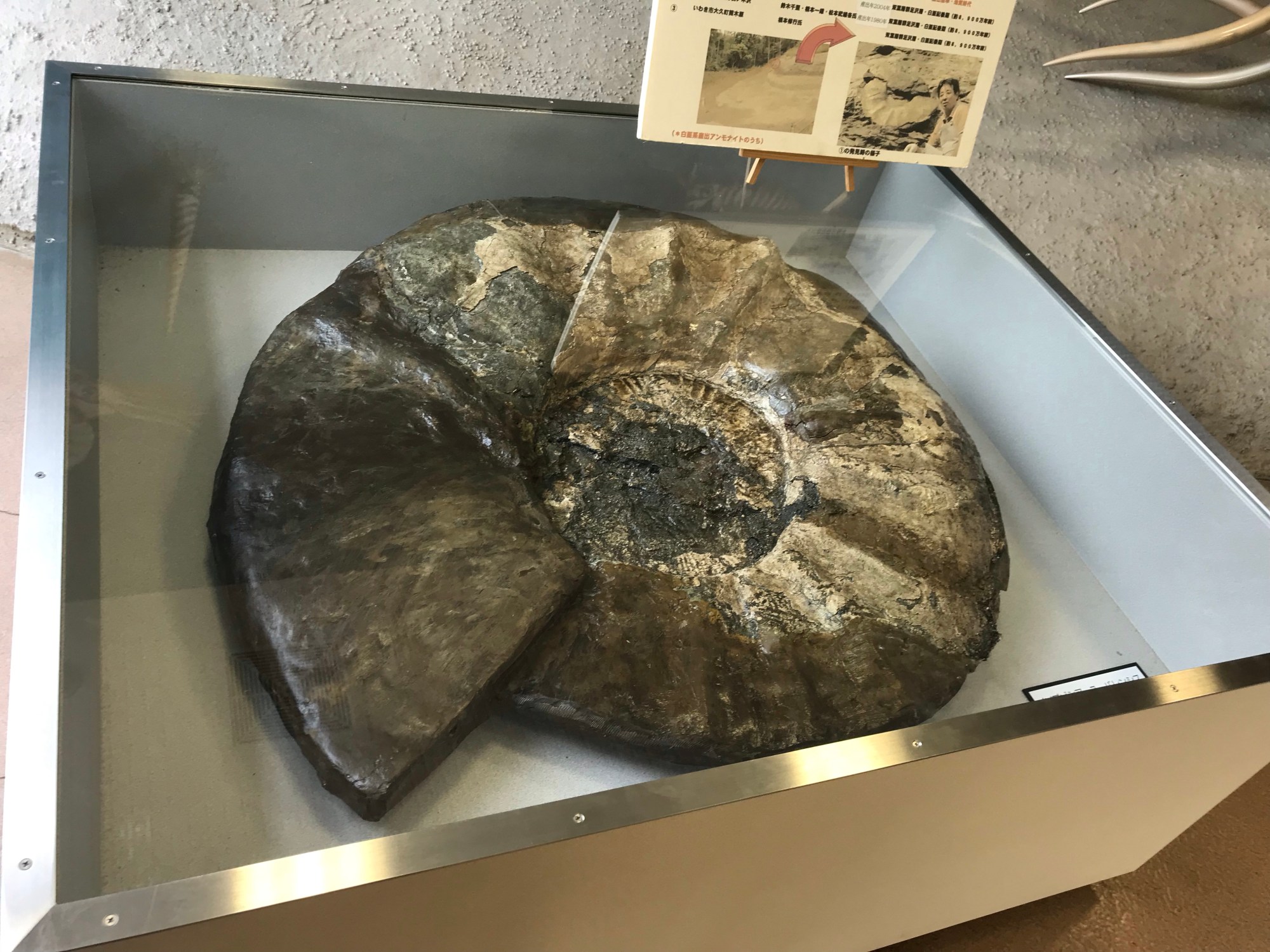 ここは白亜紀後期コニアシアン期前期(約8,900万年前)のアンモナイト等の化石が集中して発見された双葉層群に属する地層をそのまま建物で覆った施設です。山を開発する前、化石が大量に埋まっているかどうかは当然予測の域だったのですが、行政が伸るか反るかの賭けに出て予算を投じて功を奏したパターンだったそうです(ソースは熊本大学の小松先生)。