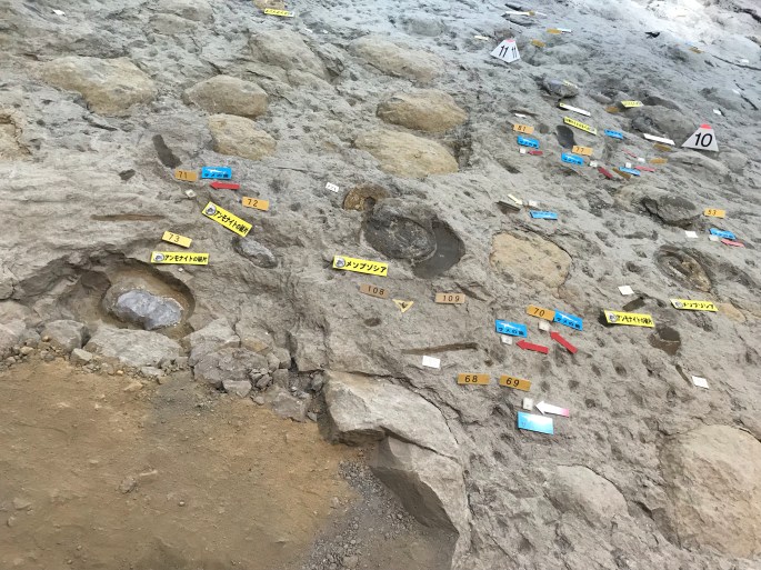 ご覧の通り、白亜紀当時いわきの海に生きていたアンモナイトなどの古生物の化石が露わになっています。