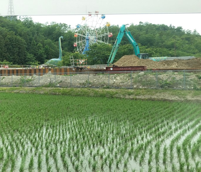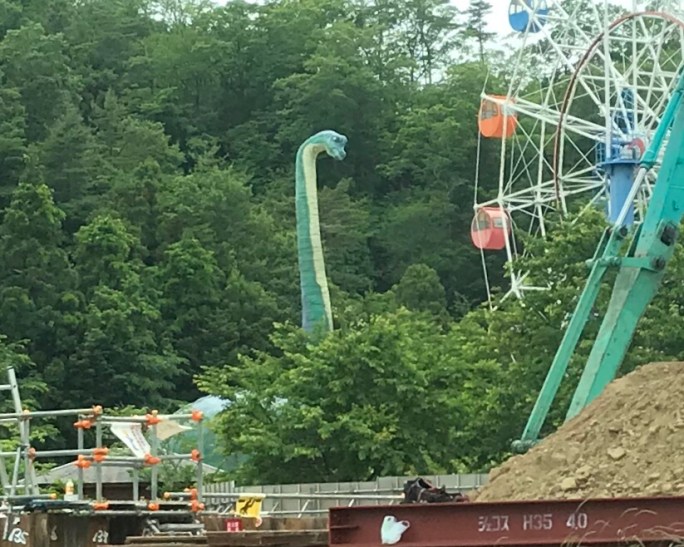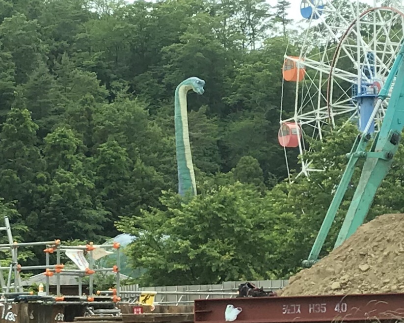 田んぼの脇に施設…なのかどうかも定かではない遊園地にしては閑静すぎる詳細不明の施設(スペースワールドと仮称)があり、ご覧の通り観覧車の隣にブラキオサウルスチックな竜脚類 Sauropod がそびえているのですが、この子はヒサノハマリュウなのかもしれません。
