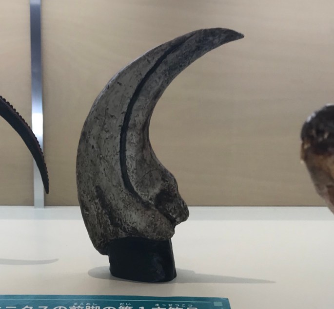 昨日もちらっと出しましたが、瀬林層 Sebayashi Formation で発見されたスピノサウルス類 Spinosaur の歯。たしかに縦に走る溝がスピノサウルス類っぽい。
