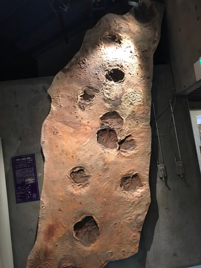 よく見るとより体重の重いイグアノドン類の足跡の方が薄く、より体重の軽い鳥の足跡の方がくっきりと残っている不思議な標本です。これはそれぞれのついたタイミングが違っていて、イグアノドン類の方は足跡がついた地面の裏にでっぱった層が残ったゴーストプリントと呼ばれるもので、鳥の方はその層に直接つけられたナチュラルプリントと呼ばれるもののようです。