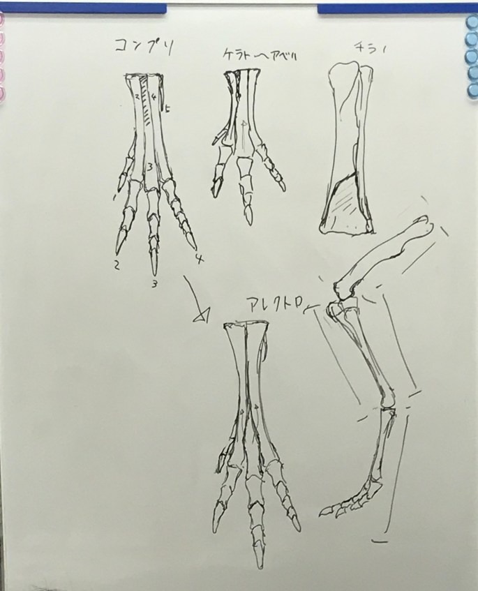 中足骨と指骨を合わせた長さが腿より少し長いのは、ティラノサウルス上科の基盤的形質で大型化すると太くなり、大腿と脛より下の長さの比率が近くなって来る。その比率はアレクトロとTレックス間で全く変わらない。この部分はみんな意外とテキトーに描いている。