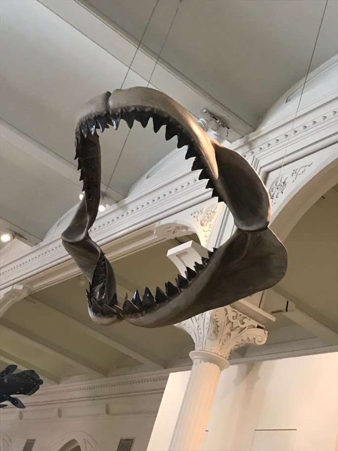 これは……なんらかの軟骨魚類、たぶんサメだと思います。大部分は骨によって支持されていないわけなので、この太い針金のフレームで全身の輪郭が作られています。ロイヤル・ティレル古生物学博物館のボレアロペルタなんかも未発見部位がこの方法で補完されていましたね。