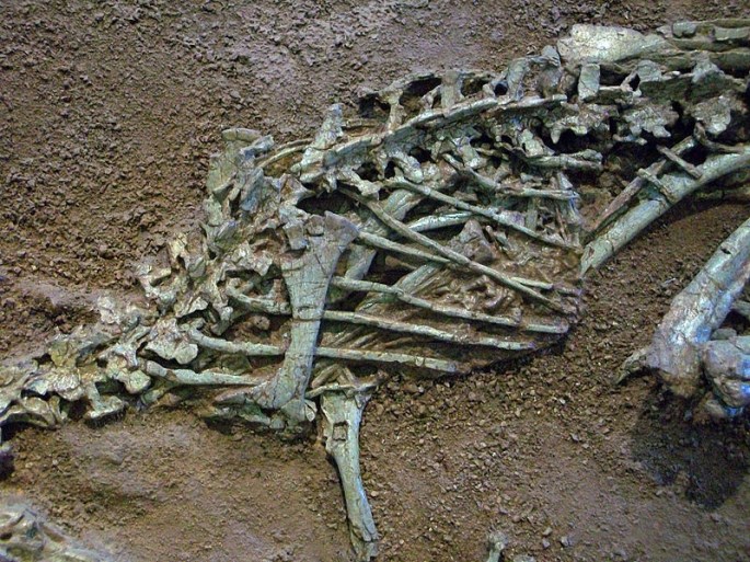 腹の中に未消化の骨が入っており、コエロフィシスの幼体と考えられ共食いの証拠とされていましたが、今日ではワニ形類 Crocodylomorph の骨だと思われています。