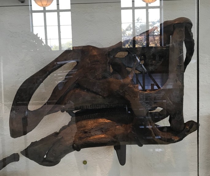 このパースがつきまくった写真に写っているのは、サウロロフス・オスボルニ Saurolophus osborni のウォールマウントですね。ホロタイプらしいです。ものすごい完全性ですね。なんか頸椎だけばらけてますが、大部分が関節していて見事です。成体ではないようです。オスボルニの成体は頭骨のみで知られていますが、成熟するとティラノサウルス Tyrannosaurus より大きくなるとの噂。