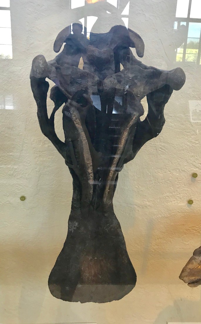 頸の神経突起は短いので自由に動くと思われます。S字ではなく若干弓状です。頸につながる前方胴椎はハドロサウルス類らしく大きく下がっています。